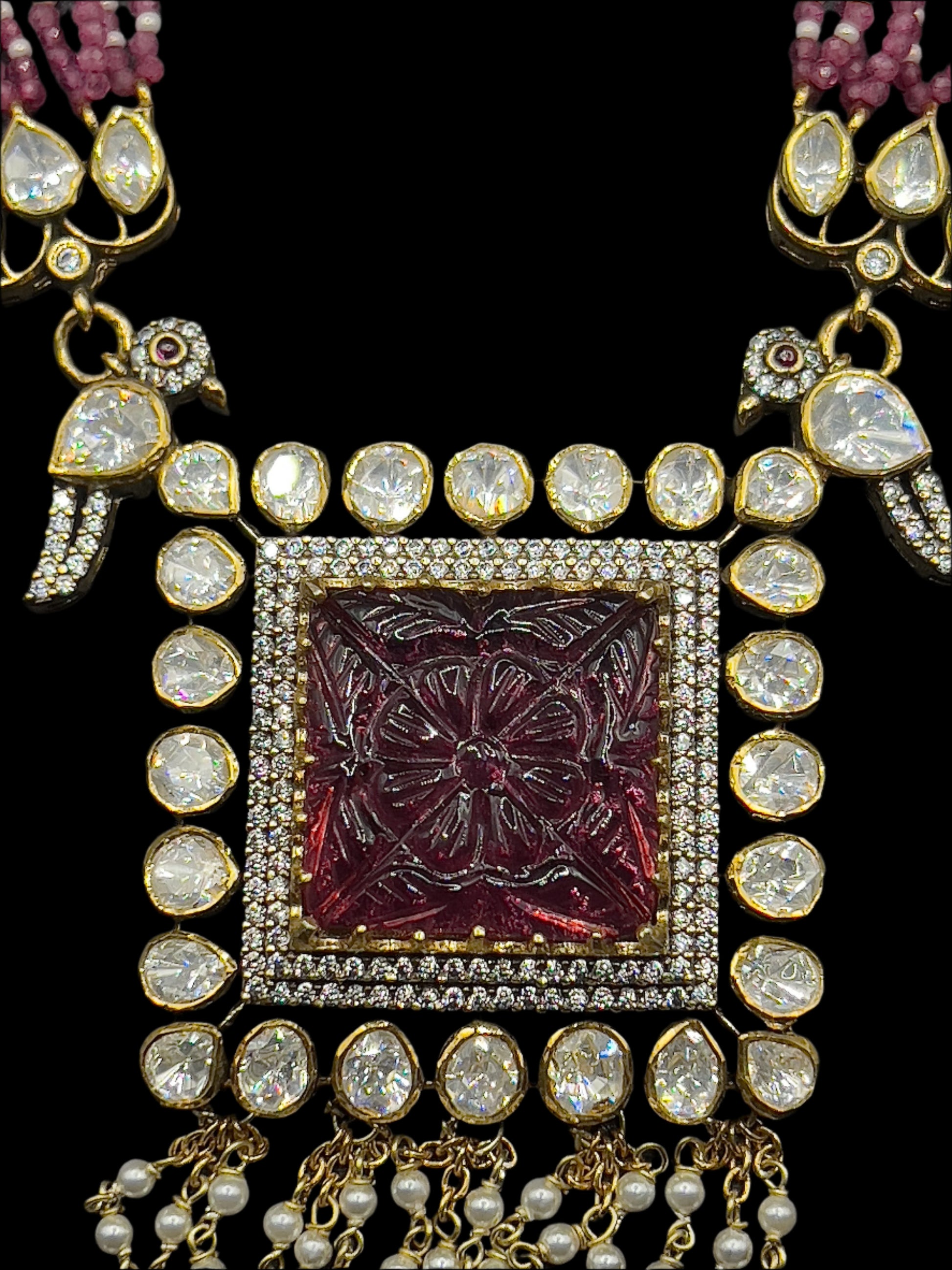 Moissanite "Carved Flower" Adjustable Pendant Set With Pink Ruby Pearls