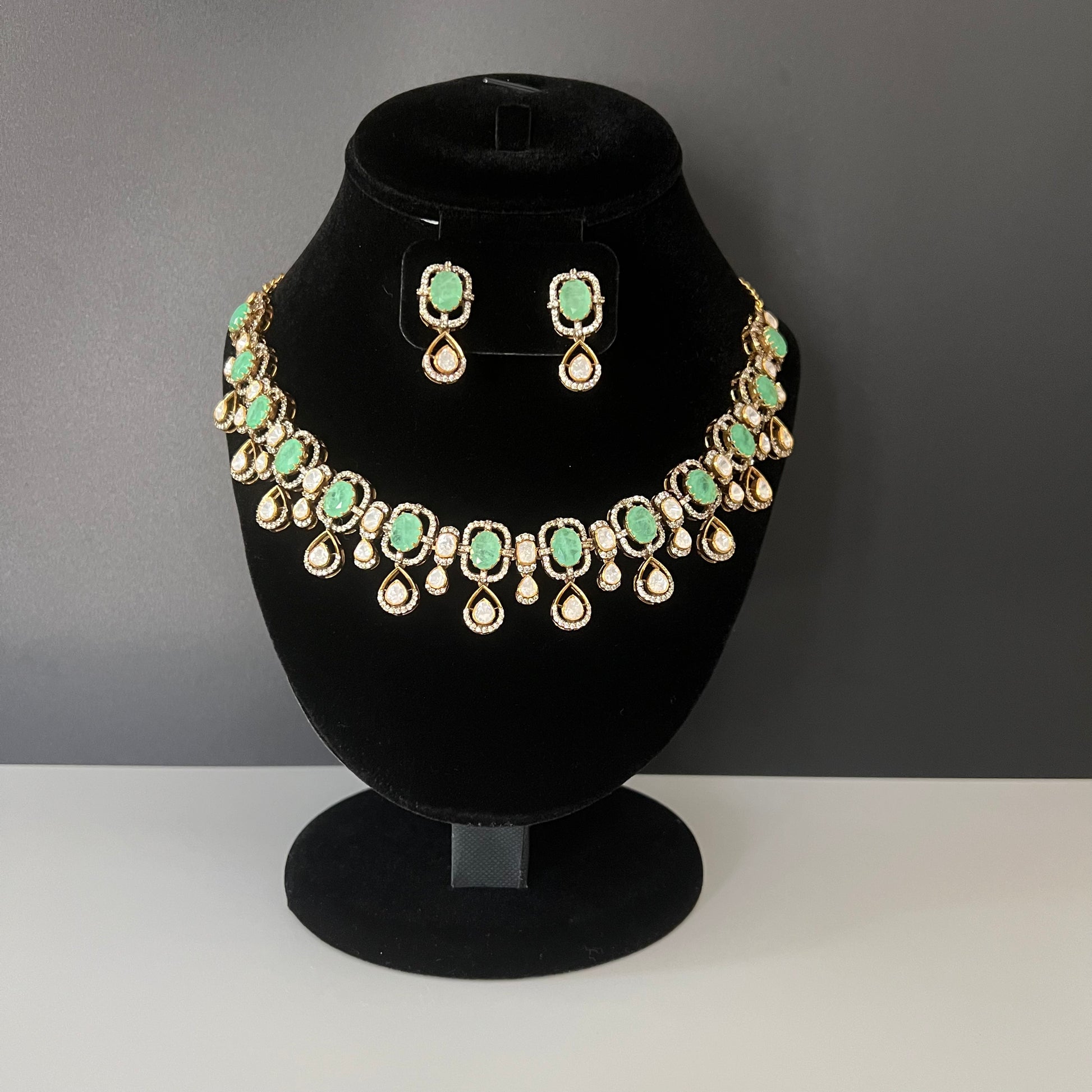 Indulge in the allure of elegance with this Moissanite Necklace and Earrings, featuring a touch of Russian Green Emerald stones. Elegantly plated in 22K gold and adorned with dazzling semi-precious stones, this exquisite set is designed to make a bold statement, making it the perfect accessory for any special occasion.